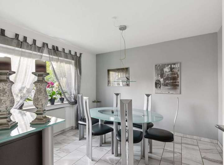 •	Das Esszimmer lädt zu gemeinsamen Mahlzeiten und Gesprächen ein.