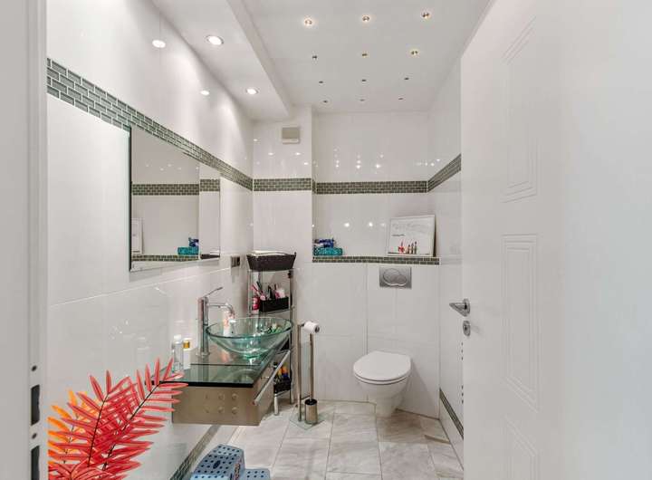 •	Das neuwertige Gäste-WC ist großzügig geschnitten und modern gestaltet.