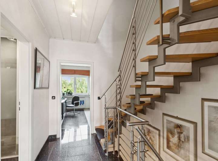 Eine Treppe führt Sie ins erste Obergeschoss, wo Wohnkomfort auf clevere Raumgestaltung trifft. Das gesamte Treppenhaus wurde mit hochwertigen Stahlgeländern ausgestattet.