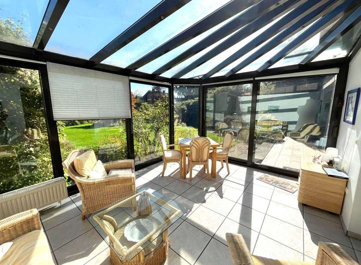 Das Erdgeschoss empfängt Sie mit einer einladenden Diele und einem Gäste-WC. Die separate Küche bietet ausreichend Platz für individuelle Kochideen. Direkt angrenzend befindet sich das Esszimmer, das in einen beheizten, vollständig abgeschlossenen Wintergarten übergeht – ein lichtdurchfluteter Raum mit Blick in den Garten, der das ganze Jahr über genutzt werden kann. Das großzügige Wohnzimmer bietet Zugang zur Terrasse in Ostausrichtung sowie zum gepflegten Garten.