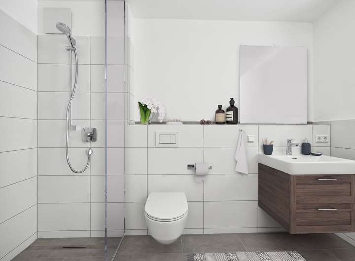 Die anthrazitfarbenen Boden- und hellen Wandfliesen, der Handtuchheizkörper sowie die modernen Sanitärgegenstände runden das Bild des großzügigen Bades mit einer Dusche ab. Waschmaschine und Trockner finden Platz im Hauswirtschaftsraum.