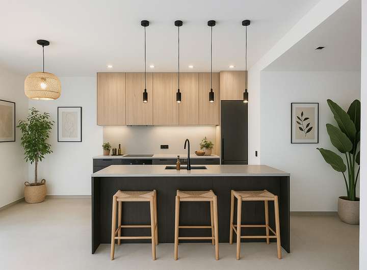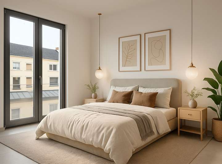 Zur Ausstattung zählen elektrische Rollläden, großformatige Fliesen und eine maßgefertigte Einbauküche mit Markengeräten (gegen monatliches Nutzungsentgelt).