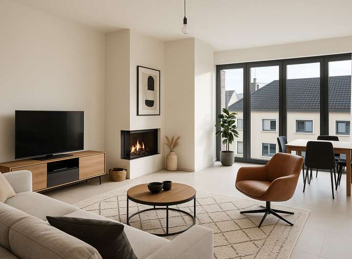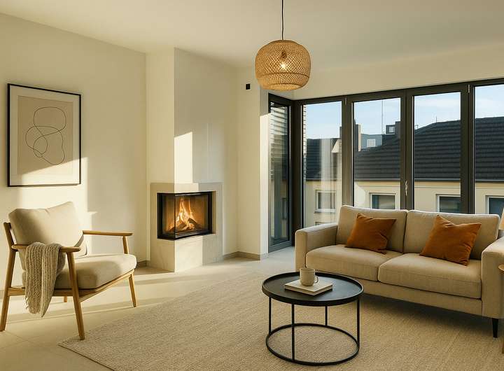 Der offene Wohn-, Ess- und Kochbereich mit Gaskamin, bodentiefen Fenstern und Fußbodenheizung sorgt für ein helles, einladendes Ambiente. Zwei großzügige Schlafzimmer, ein hochwertiges Bad mit Wanne und bodentiefer Dusche sowie ein separates Gäste-WC bieten hohen Wohnkomfort.
