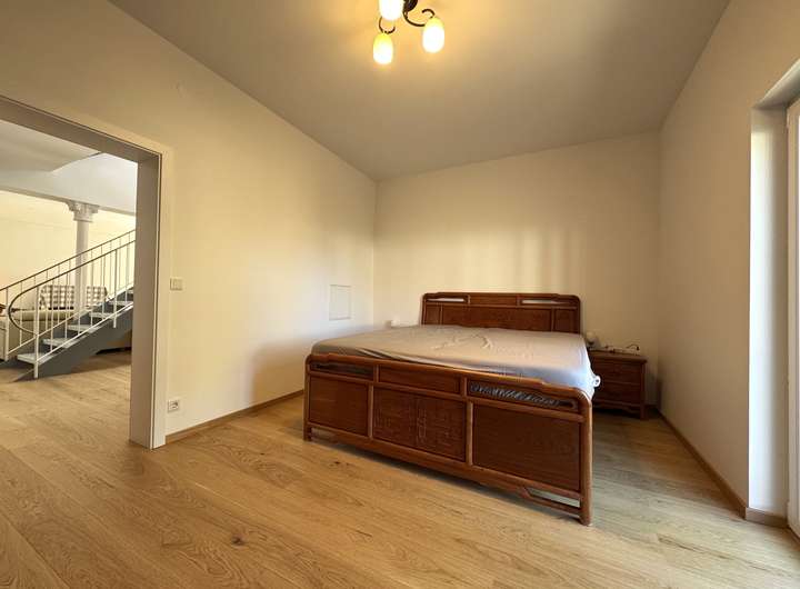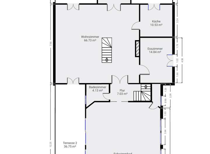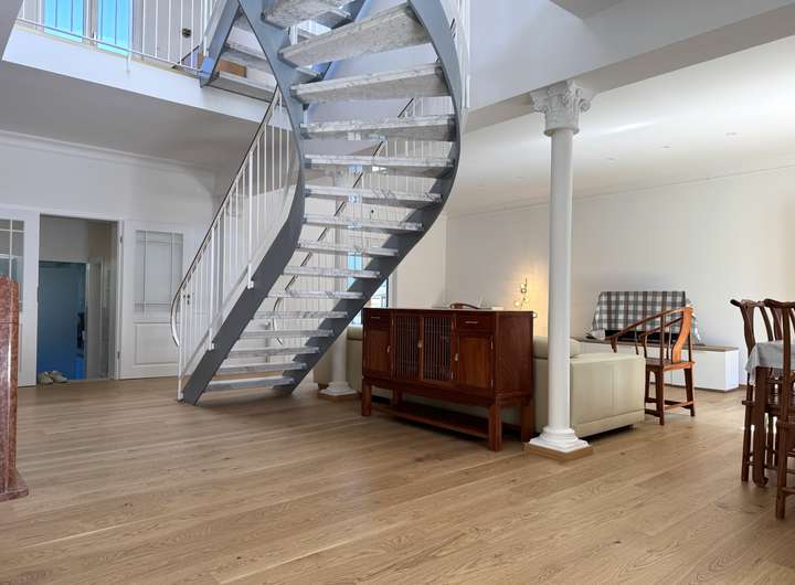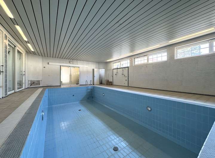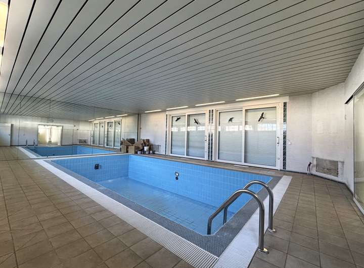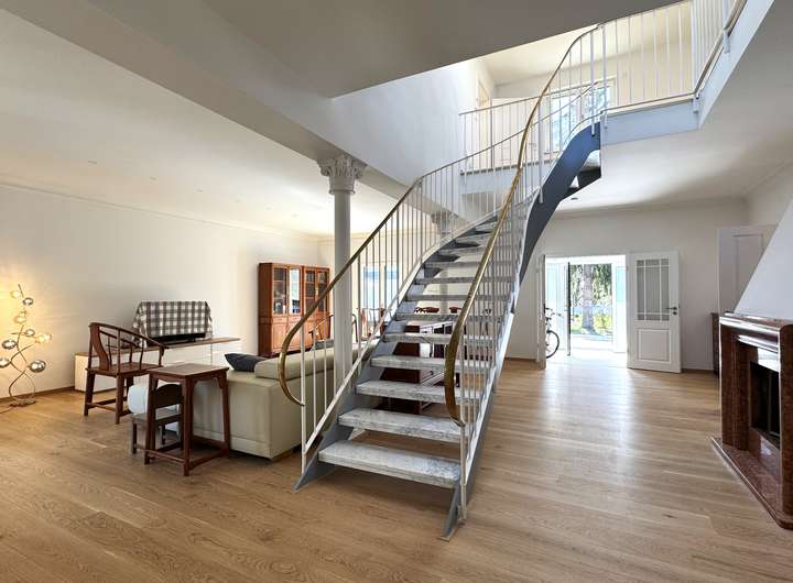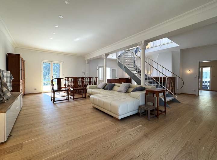 Im Erdgeschoss erwarten Sie der großzügige Wohnbereich mit Kamin, eine separate Küche sowie ein Schlafzimmer. Des Weiteren befinden sich hier ein Gäste-WC sowie das Schwimmbad mit angrenzender Außenterrasse. Der Innenbereich des Hauses ist offen gestaltet, welchen die freiliegende Treppe mit ihrem besonderen Charme unterstreicht.