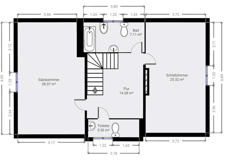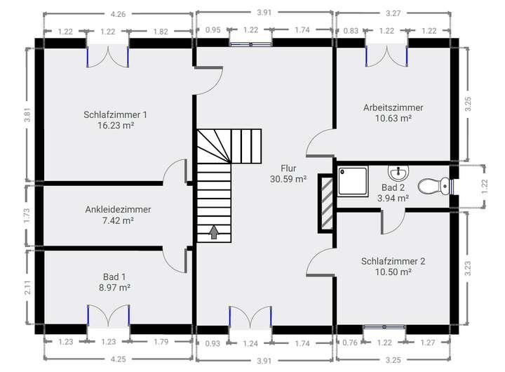 Im zweiten Obergeschoss befinden sich zwei geräumige Arbeitszimmer bzw. Gastzimmer, ein Tageslichtbad mit Wanne und ein separates Gäste-WC.