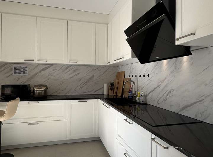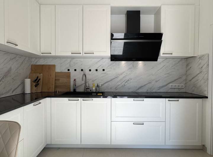 Neue moderne Einbauküche der deutschen Marke PLANA mit Miele & Siemens iQ700 Geräten, Arbeitsplatten aus Nero Pretoria Granit, matten Marmor-Rückwänden und ultramatten Fronten.