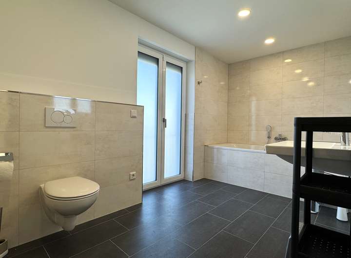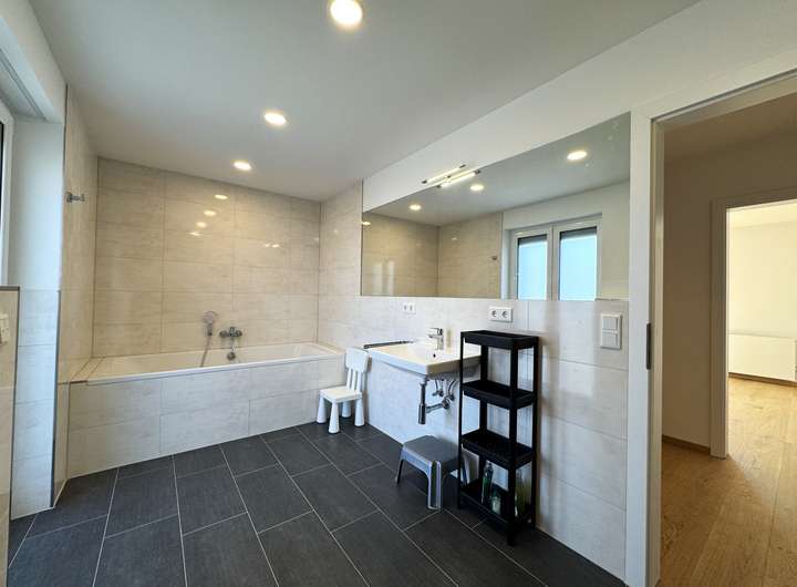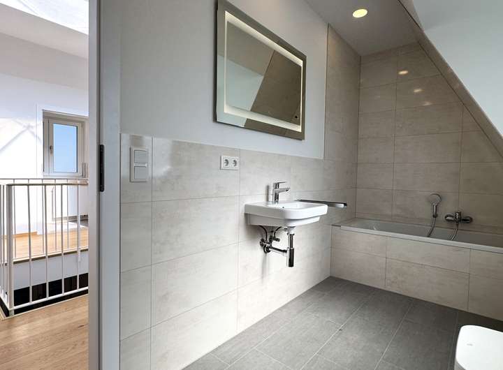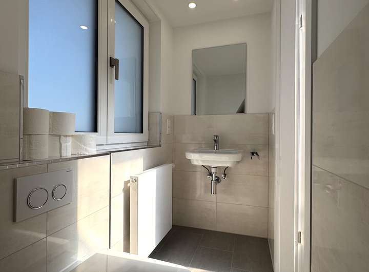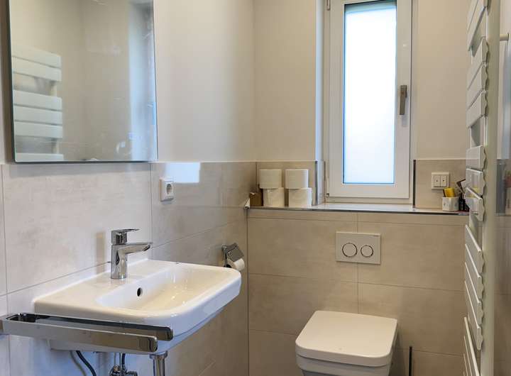 4 komplett sanierte Badezimmer (davon 3 mit Fenster) + 2 Gäste-WCs, mit Marken wie Villeroy & Boch, GROHE, Geberit. Neu verlegte Wasserleitungen, Strom und Fliesen