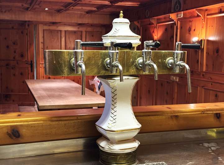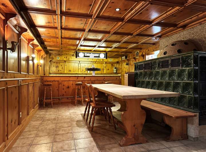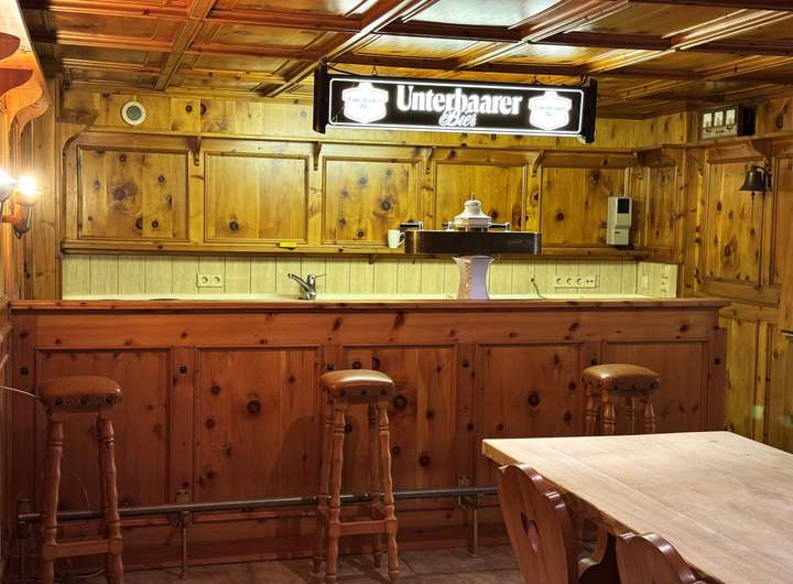 Traditionell gestalteter Weinkeller mit Holzverkleidung, Holzdecke, stilvoller Bar – ein privater Rückzugsort mit Charakter.