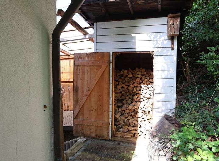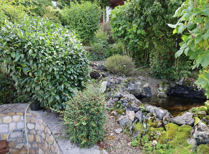 Der liebevoll angelegte Garten bietet schöne Terrassen, besondere Sitzplätze, drei kleine Teiche und Holzschopf.