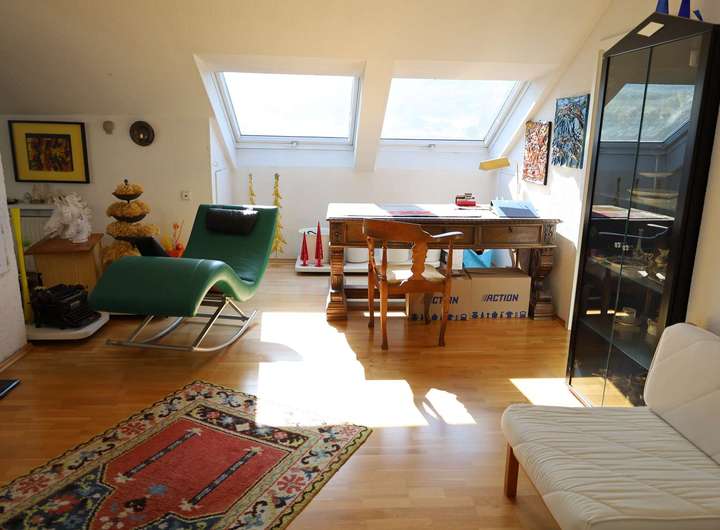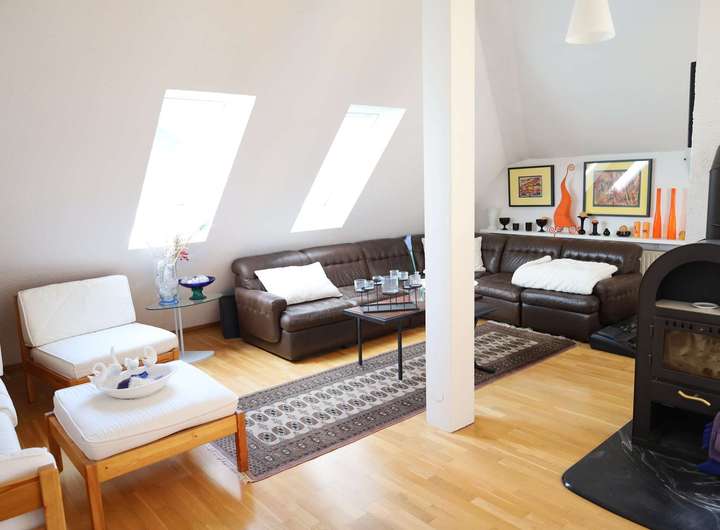 Ein weiteres Highlight ist das ausgebaute, lichtdurchflutete Dachgeschoss mit großzügigem Wohnbereich und Holzofen sowie einem Schlafzimmer und einen WC mit Waschbecken.