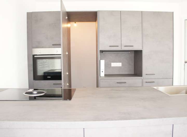 Im Mietpreis inbegriffen ist eine voll ausgestattete und moderne Einbauküche mit Raffinessen, die das Herz eines jeden Hobbykoches höherschlagen lässt. Eine Speisekammer versteckt sich hinter der Küche.