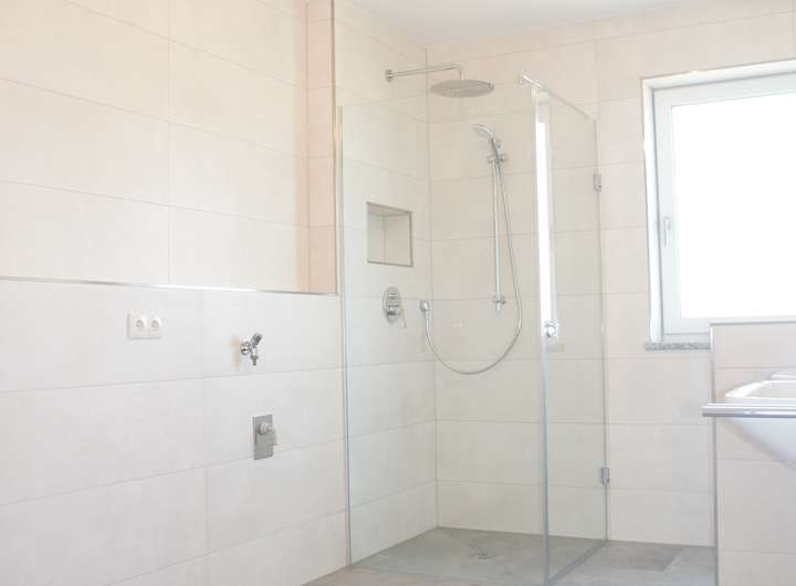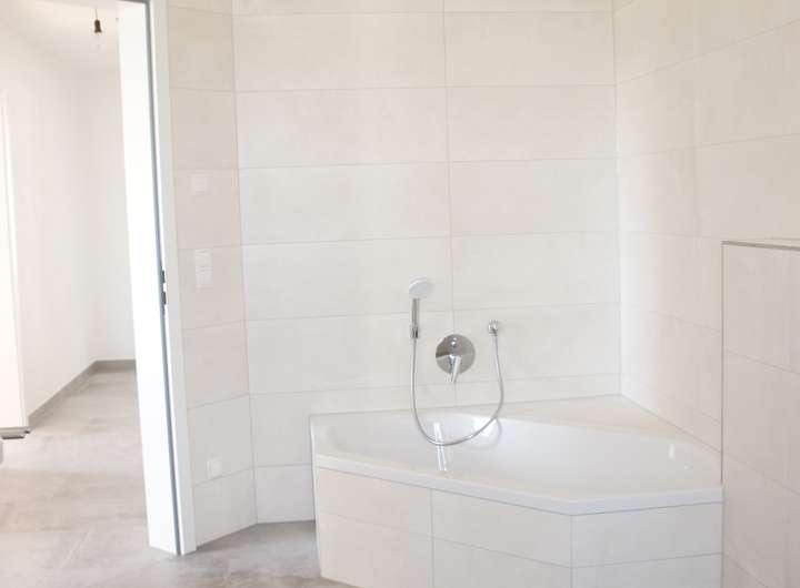 Das Badezimmer verfügt neben Fenster über eine übergroße Dusche, eine Badewanne und ein Doppelwaschbecken. Auch der Waschmaschinenanschluss ist im Badezimmer vorhanden.