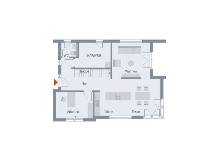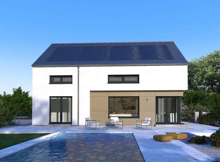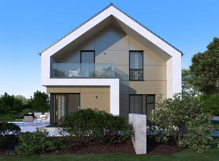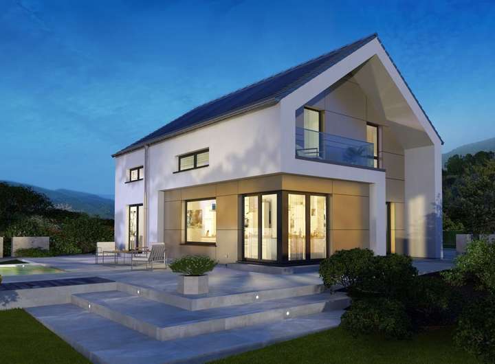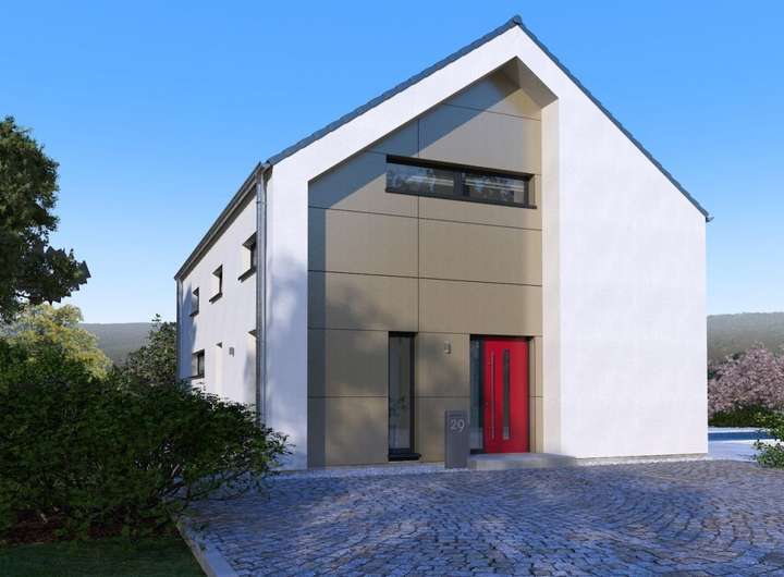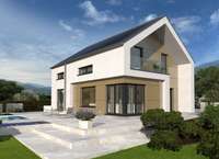 Klassisch und stilvoll präsentiert sich das 2-geschossige Einfamilienhaus Design 13. Unter dem Satteldach vereinen sich moderne Architektur und höchster Wohnkomfort. Im Entrée trennt die offene Treppe WC und HWR räumlich vom restlichen Wohnbereich ab. Auch das Büro findet hier seinen Platz. Der offene und helle Koch- und Wohnbereich wird durch ein freistehendes Wandelement gekonnt unterbrochen. Vom Wohn- und Esszimmer geht es zur großflächigen Eckterrasse. Im Obergeschoss ist die Elternsuite mit Bad und Ankleide dank kluger Raumaufteilung geschickt von den Kinderzimmern mit eigenem Dusch-WC abgegrenzt. Der Dachvorsprung an der Giebelseite setzt nicht nur gestalterische Akzente, sondern sorgt auch für einen geschützten Aufenthalt im Freien.
