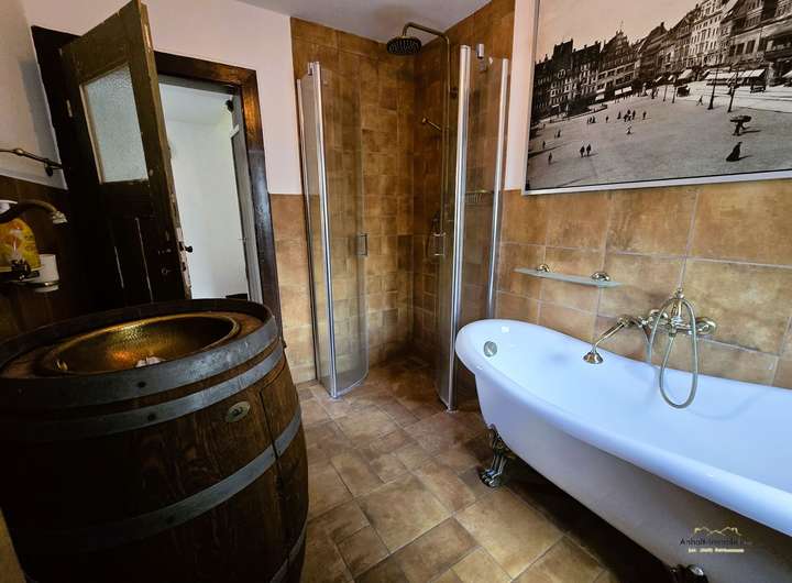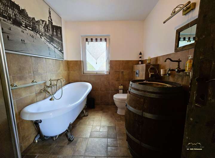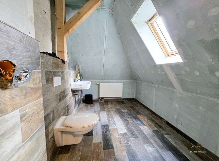 Ein besonderes Highlight ist das stilvolle Badezimmer im Erdgeschoss. Hier erwarten Sie sowohl eine moderne Dusche als auch eine elegante freistehende Badewanne, die zum Entspannen einlädt. Ein zweites Badezimmer befindet sich im Dachgeschoss. Dieses ist bereits in den finalen Zügen der Sanierung und wartet nur noch auf seine letzten Feinschliff-Arbeiten, um in vollem Glanz zu erstrahlen.