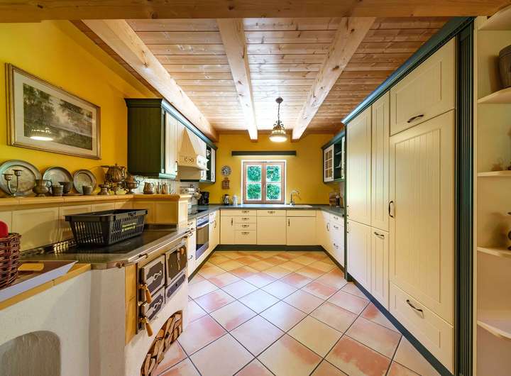 Im Erdgeschoss befindet sich eine großzügige und helle Küche, die mit Elektrogeräten und zusätzlich mit einem Küchenofen (Holz) ausgestattet ist.