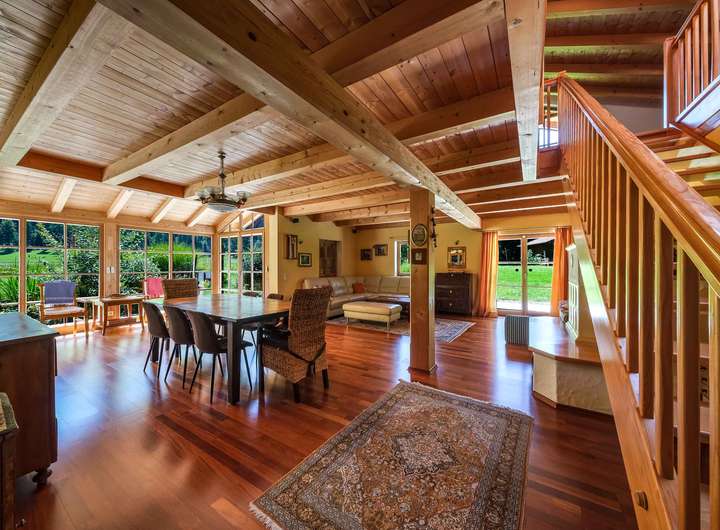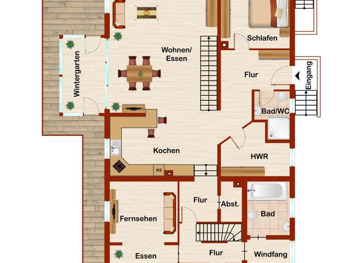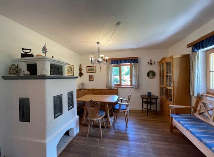 Durch den angrenzenden Wintergarten sind alle Räume lichtdurchflutet und zu jeder Jahreszeit ein angenehmer Rückzugsort. Der traditionelle Kachelofen sorgt zusätzlich für eine warme, behagliche Atmosphäre.