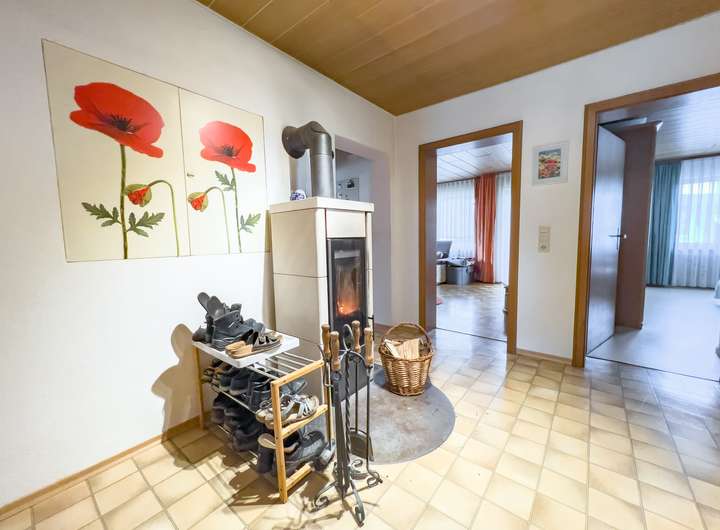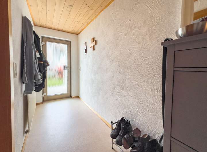 Erdgeschoss: Windfang mit Treppe zum Dachgeschoss, Wohnzimmer mit Zugang zum Balkon, abgeschlossene Wohnküche ebenfalls mit Zugang zum Balkon, 2 Schlafzimmer, Badezimmer mit Badewanne, Dusche und Waschbecken, ein WC mit Waschbecken.