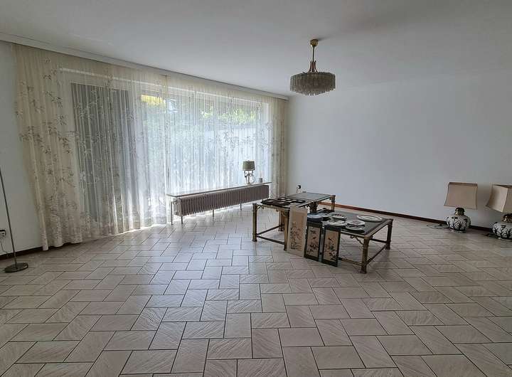 Großzügiges, helles Wohnzimmer mit Zugang zum kleinen, pflegeleichten Garten