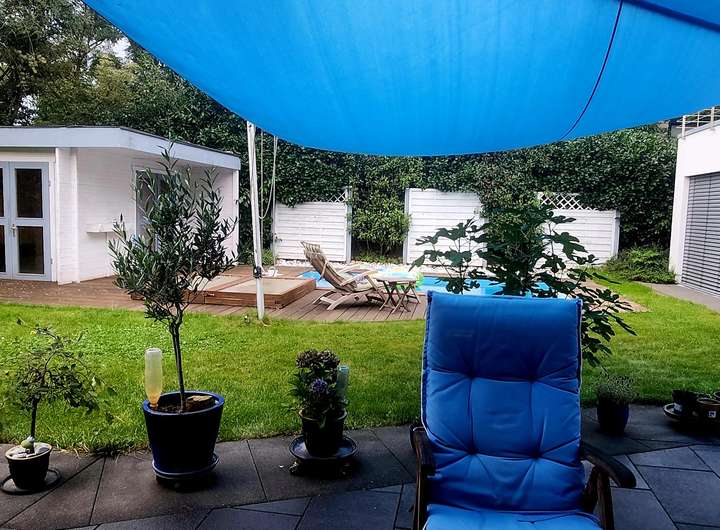 Parket im Schlafbereich, Fliesen im Wohnbereich, Bodentiefe Fenster, Kamin, Fußbodenheizung, 16m² Sonnensegel