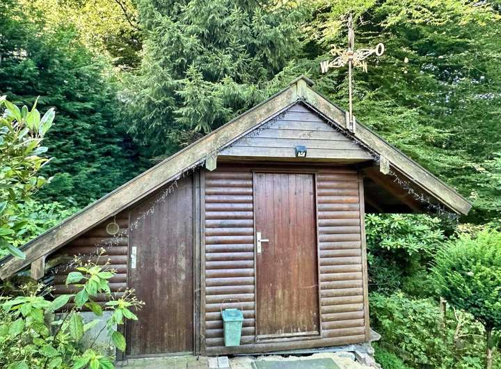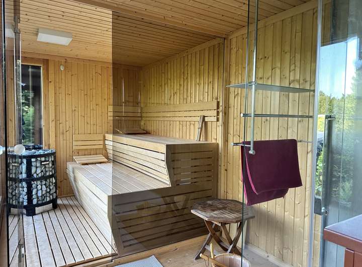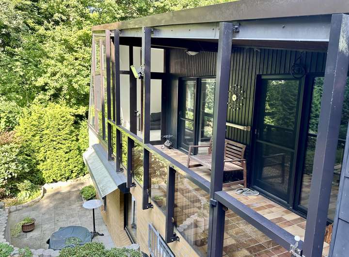 Zwei Hausseiten sind von einer großzügigen Loggia umgeben: teils als geschlossener Anbau, teils nach vorne hin offen, stets mit besonderer Wohnatmosphäre. Das Grundstück ist terrassenförmig angelegt und durch seine Hanglage besonders reizvoll. Am oberen Ende des Gartens erwartet Sie ein weiteres Highlight: eine moderne Sauna inklusive Dusche, mit traumhaftem Ausblick über ihr Haus und den angrenzenden Wald.