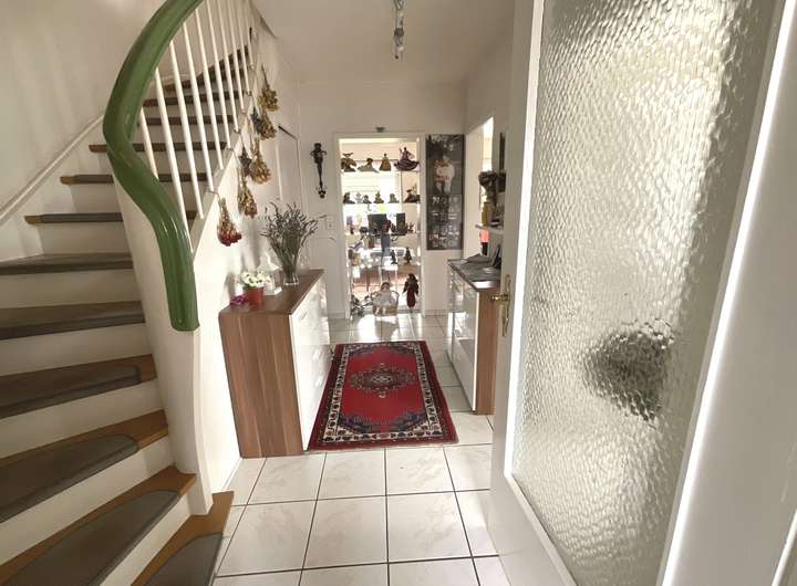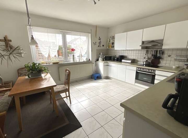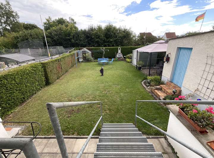 Im Erdgeschoss befinden sich ein Windfang, ein Gäste-WC, eine große Wohnküche und ein geräumiges Wohnzimmer. Vom Wohnzimmer aus haben Sie Zugang zum sonnigen und schönen Garten. Der pflegeleichte Garten lädt zum Verweilen und Entspannen ein und bietet Platz für gemütliche Grillabende mit Familie und Freunden.