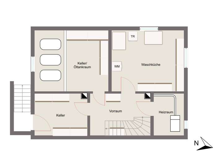 Das Haus ist voll unterkellert. Beheizt wird es über eine Öl-Zentralheizung. Im Untergeschoss befinden sich der Heizungskeller, ein Öllagerraum, eine große Waschküche und ein Keller mit Zugang zum Garten. Über eine Kelleraußentreppe gelangen Sie direkt in den rückwärtigen Gartenteil.
