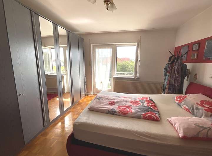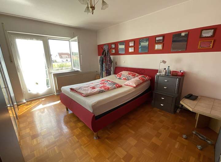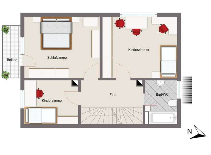 Über das Treppenhaus gelangen Sie in das Obergeschoss. Hier finden sich das Eltern-Schlafzimmer, zwei Kinderzimmer sowie das Tageslichtbad mit Badewanne, WC und Waschbecken. Das Schlafzimmer hat Zugang zu einem kleinen Balkon mit Blick in den Garten.