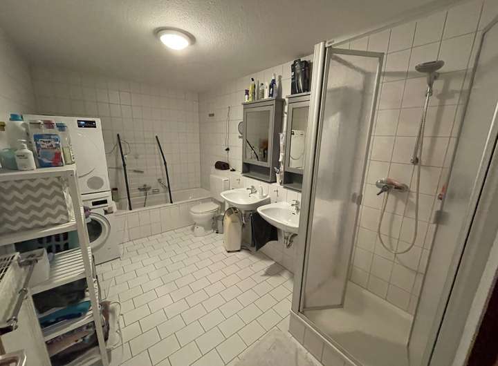 - Zweites innenliegendes Badezimmer mit Badewanne, Dusche, Doppelwaschbecken sowie Anschluss für Waschmaschine und Trockner