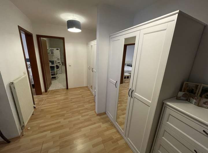 Der Lebensmittelpunkt der Wohnung ist der weitläufige Wohn- und Essbereich mit Zugang zur sonnigen Loggia. Von hier aus gelangen Sie direkt in die Küche sowie in ein helles Schlafzimmer und das Tageslichtbad.