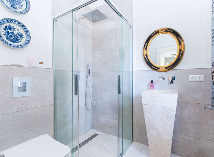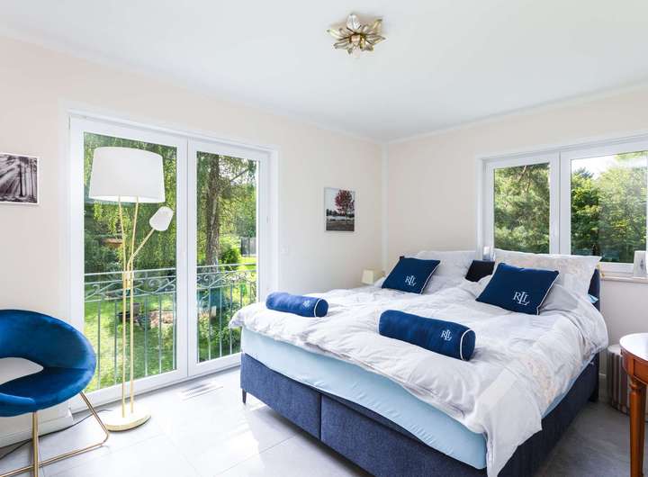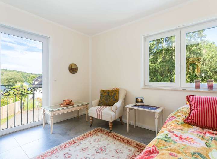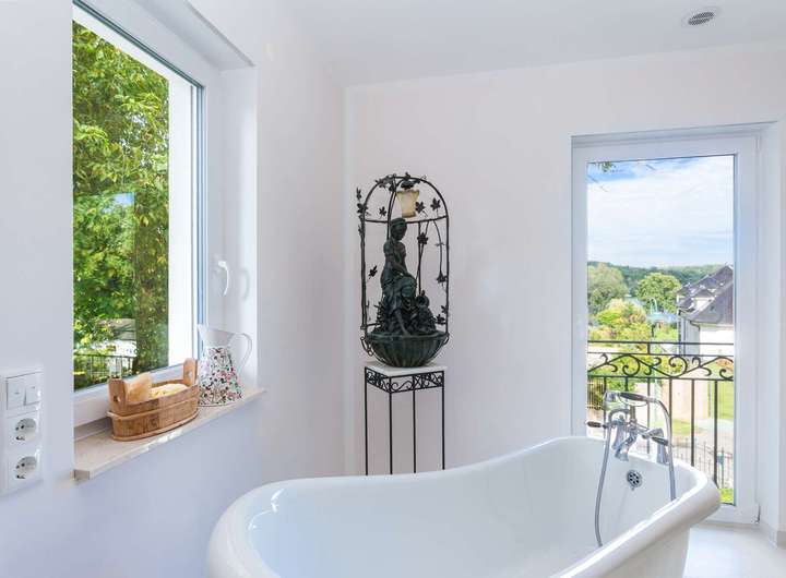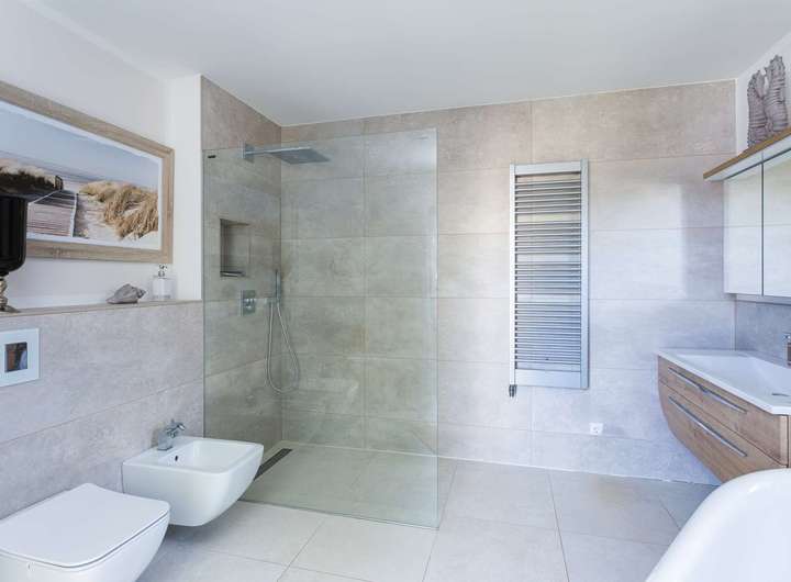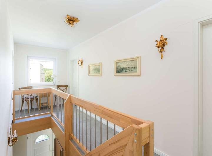 Im Obergeschoss erwartet Sie der private Rückzugsbereich: Das Master-Schlafzimmer beeindruckt mit einem separaten Ankleidezimmer, das Raum für Ihre Garderobe und persönlichen Luxus bietet. Zwei weitere, helle Zimmer eignen sich ideal als Kinder-, Gäste- oder Arbeitszimmer. Das Highlight ist das exklusive Badezimmer – ausgestattet mit freistehender Badewanne, großzügiger Walk-in-Dusche und einem traumhaften Blick auf den See. Die Lüftungsanlage im gesamten Haus sorgt für ein angenehmes Wohnklima.