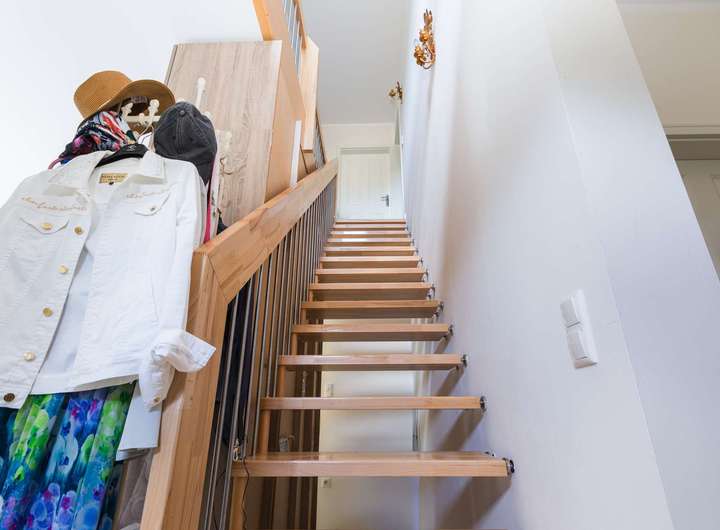 Bereits beim Betreten des Hauses empfängt Sie der großzügige, offene Wohn- und Essbereich mit hochwertiger Einbauküche. Großflächige Fensterfronten lassen den Raum im Tageslicht erstrahlen und öffnen den Blick auf den liebevoll angelegten Garten. Ein stilvoller Kaminofen schafft eine warme, einladende Atmosphäre – perfekt für gemütliche Abende mit Familie und Freunden. Das Erdgeschoss verfügt zudem über ein elegantes Gäste-WC mit Dusche, das Funktionalität und Design harmonisch verbindet.