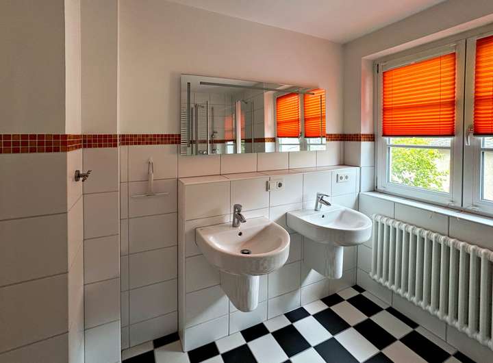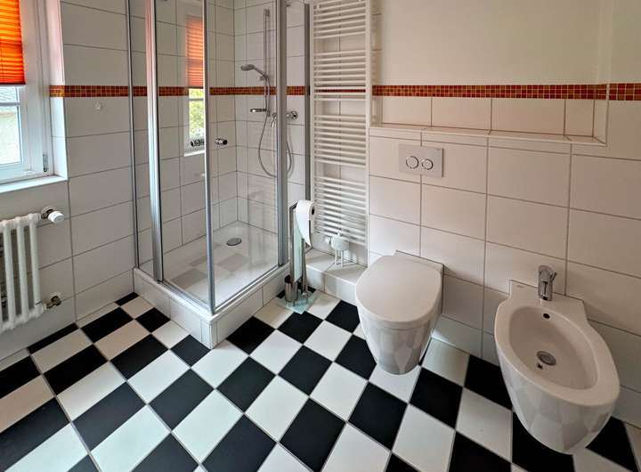 2 Zimmer, 1 kleines Bad mit Wanne und Waschtisch, 1 großes Bad mit Dusche und Echtglas-Duschkabine, 2 Waschbecken, WC, Bidet, Handtuchtrockner