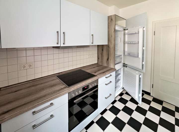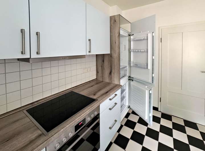 Wohn- und Esszimmer, Gäste-WC, Einbauküche mit E-Herd, Dunstabzugshaube, Spülmaschine, Gefrierkombination (alle Geräte von Bosch)