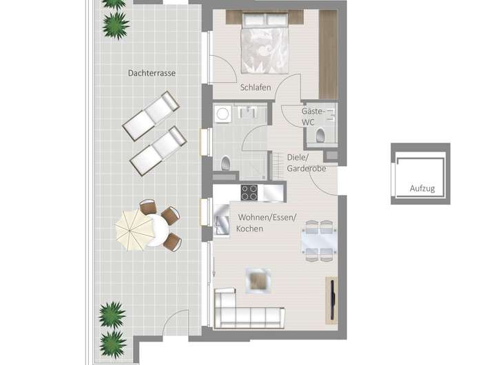 Hochwertiges 2,5 Zi. Penthouse mit weitläufiger Dachterrasse vor allen Fenstern, Parkett und Fliesen, ruhiges Schlafzimmer, Tageslichtbad, separatem WC, offene Küche, Fußbodenheizung und Aufzug. Tiefgaragenstellplatz optional.