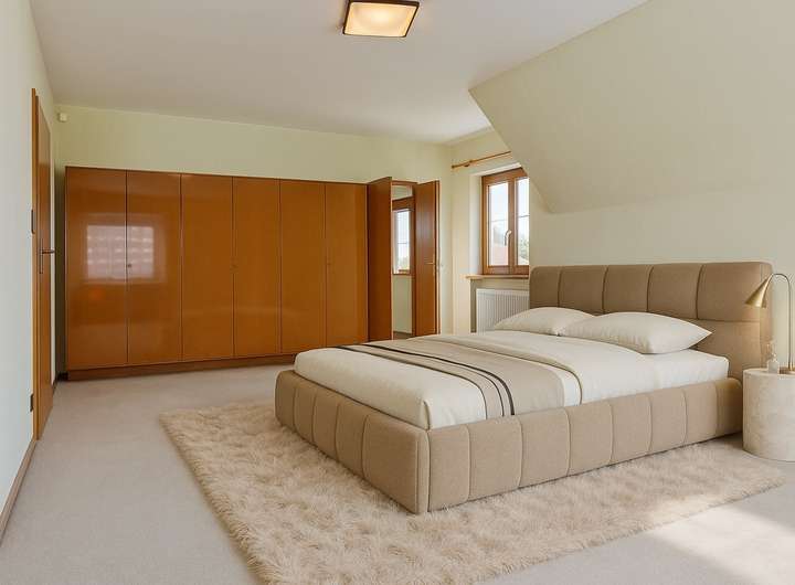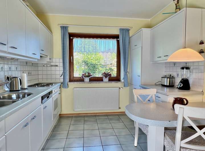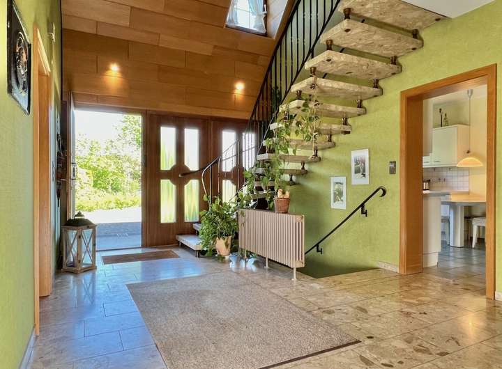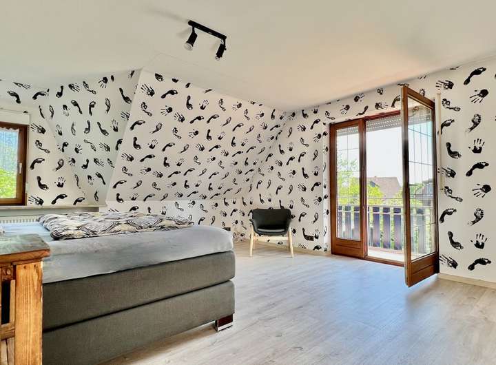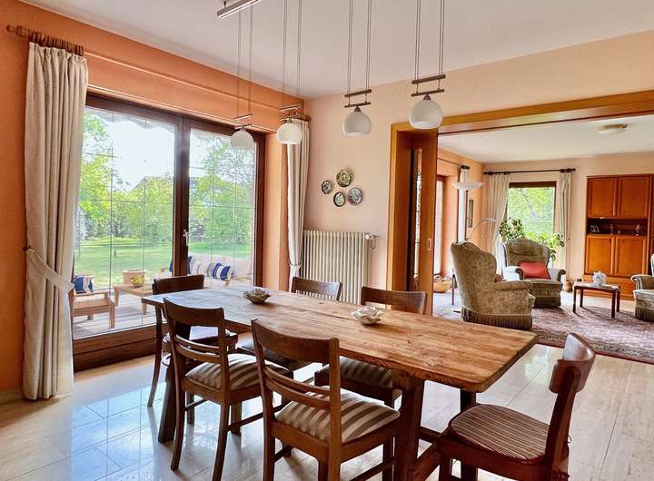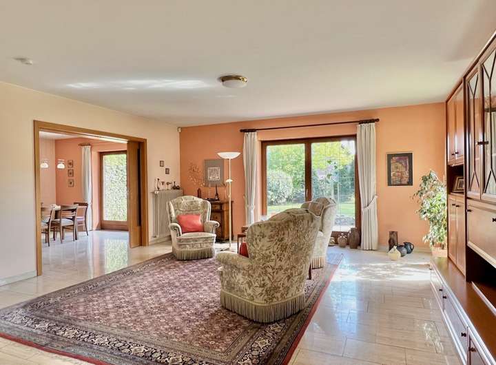 Sie suchen ein stilvolles, neues Zuhause in ruhiger Umgebung bei gleichzeitig guter Infrastruktur im Ort und optimaler Erreichbarkeit? Dann ist dieses schöne Landhaus perfekt für Sie geeignet. Durch das einladende Entrée erreichen Sie den offenen Wohn- und Essbereich. Bodentiefe Fenster bieten einen herrlichen Blick in den idyllischen Garten und sorgen für einen lichtdurchfluteten Wohnraum. Ein stilvoller Kachelofen verschafft in den kühleren Jahreszeiten wohlige Wärme. Auf dieser Ebene befinden sich außerdem die Küche, das Gäste-WC, ein Büro sowie ein praktischer Hauswirtschaftsraum. Auf der teilüberdachten Terrasse mit Süd-Ausrichtung und elektrischer Markise können Sie bis abends mit Familie und Freunden die Sonne genießen. Der repräsentative Treppenaufgang führt Sie ins Obergeschoss mit Galerieflur, Duschbad, 2 Kinderzimmern mit Zugang zur sonnigen Loggia sowie dem Elternschlafzimmer mit begehbarem Kleiderschrank und Bad en Suite mit Wanne und Dusche. Der Keller ist ausgestattet mit einem Partykeller, WC, 3 Abstellräumen, Trockenraum sowie einem Heizungsraum mit Viessmann Gas-Brennwertkessel und Warmwasserspeicher (Beides Baujahr 2022). Die Ausrichtung des Daches ist optimal für die Installation von Solarpaneelen. Außen bietet Ihnen eine geräumige Doppelgarage mit elektrischen Toren, Wallbox, Abstellraum und weiterer Abstellfläche auf dem Dachboden viel Platz. Im Garten steht Ihnen ein Geräteschuppen sowie ein Holzunterstand zur Verfügung. Vier Zapfstellen für Grundwasser können zur Bewässerung genutzt werden. Das Haus verfügt bereits über großzügige Wohnflächen Mit seinem 1.682 m² großen Grundstück bietet es Ihnen, dem gültigen Bebauungsplan zufolge, außerdem die Möglichkeit, bei Bedarf bis zu ca. 200 m² weitere, mögliche Geschossfläche zu schaffen. Damit haben Sie wunderbare Optionen zur Erweiterung der Wohnanlage, je nach Bedürfnis und Lebenssituation. Bei größerem Raumbedarf wäre z.B. ein Anbau möglich. Auch ein Gästehaus, zusätzliche Garagenflächen oder ein Swimmingpool mit Poolhaus wären denkbar. Mit nur wenig Modernisierungsaufwand können Sie diese Immobilie zu Ihrem wunderschönen, neuen Zuhause machen. Gerne übersenden wir Ihnen ein ausführliches Exposé.
