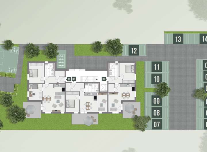 14 Außenstellplätze und ein großzügiges Fahrrad- und Mülltonnenhaus runden das Angebot ab.