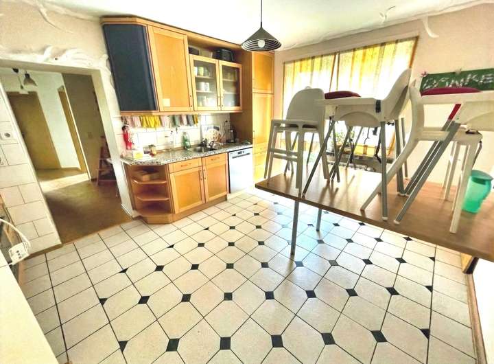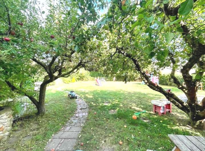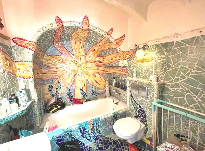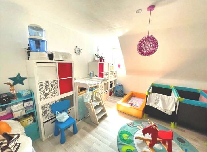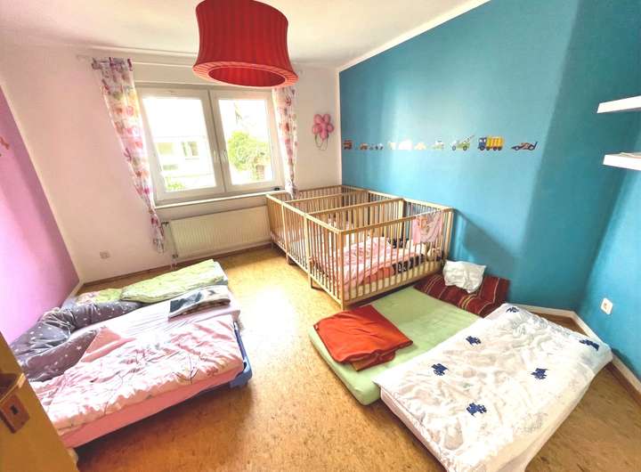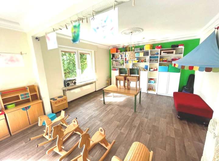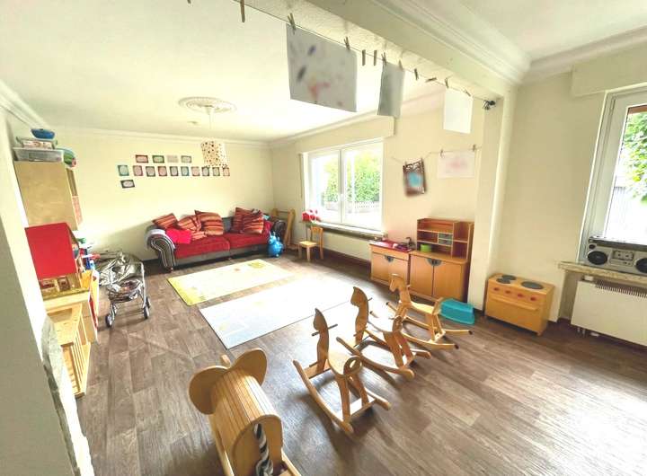 Das Erdgeschoss verfügt über ca. 105,57 m² Wohnfläche und ist seit 2014 an eine Kindertagesstätte vermietet, die eine monatliche Kaltmiete von 700 Euro erzielt. Die Räume umfassen ein großzügiges Spielzimmer, das durch die Zusammenlegung zweier Zimmer entstand, ein weiteres Spielzimmer mit direktem Zugang zur Terrasse, eine Küche, ein Büro sowie einen Schlafraum für den Mittagsschlaf der Kinder. Zwei Badezimmer runden diese Einheit ab: ein innenliegendes Bad mit Badewanne und farbenfrohen Mosaikfliesen sowie ein weiteres Bad mit Dusche und Fenster im Anbau. Der Garten mit Schuppen steht ebenfalls zur Verfügung. Zum Erdgeschoss gehören außerdem vier Kellerräume und ein zusätzliches Bad mit Dusche und WC, auch hier mit dekorativen Mosaikfliesen. Besonders praktisch: Der Keller ist über einen separaten Außenzugang erreichbar, sodass eine klare Trennung zwischen Wohn- und Nutzfläche gewährleistet ist.