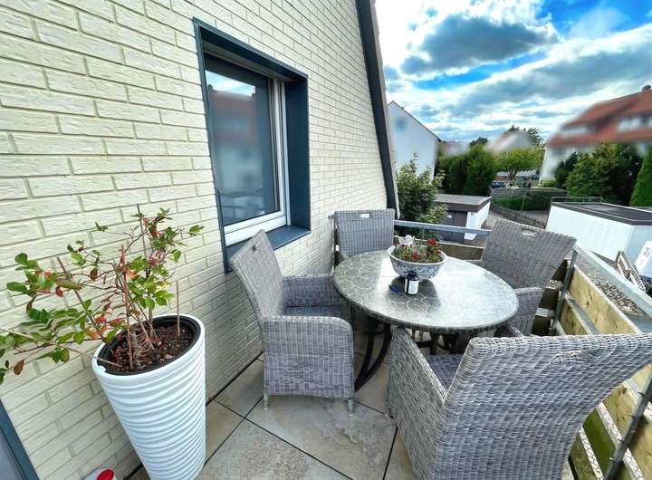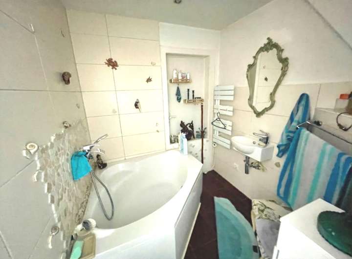 Das Dachgeschoss bietet ca. 87,12 m² Wohnfläche. Seit 2018 ist die Wohnung für eine monatliche Kaltmiete in Höhe von 400 Euro vermietet und wird von der Mieterin sowohl privat als auch für ihre Tätigkeit als Tagesmutter genutzt. Die Räume gliedern sich in ein Wohnzimmer, eine Küche, zwei weitere Zimmer und ein Schlafzimmer mit angrenzendem, überdachtem Balkon und Blick in den Garten. Ein zusätzlicher Balkon befindet sich oberhalb des Windfangs. Das Badezimmer wurde durch die Zusammenlegung eines Zimmers mit dem ursprünglichen Bad großzügig erweitert und ist heute mit einer komfortablen Eckbadewanne ausgestattet. Zur Einheit gehören zudem ein Kellerraum sowie der Heizungsraum.