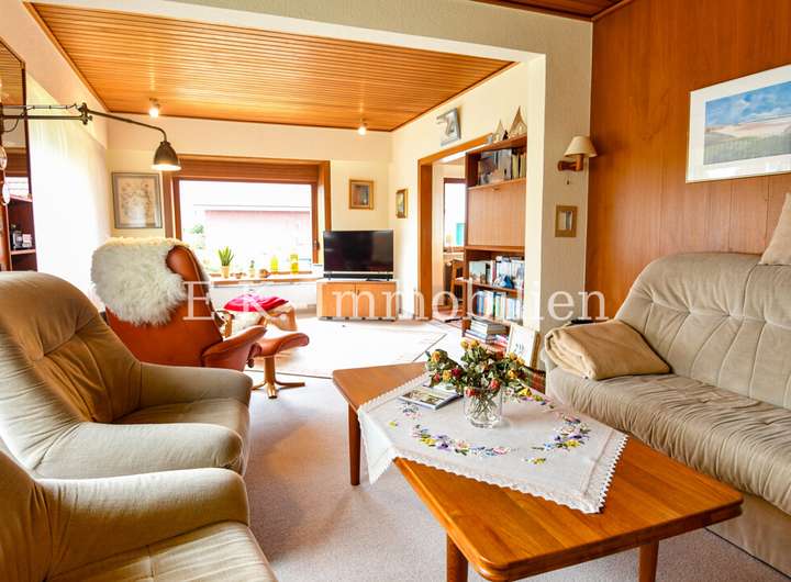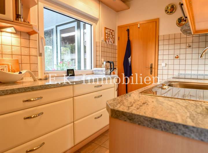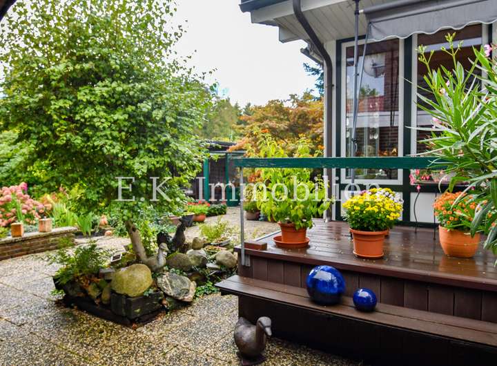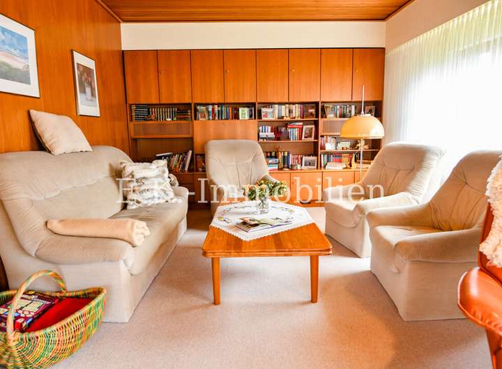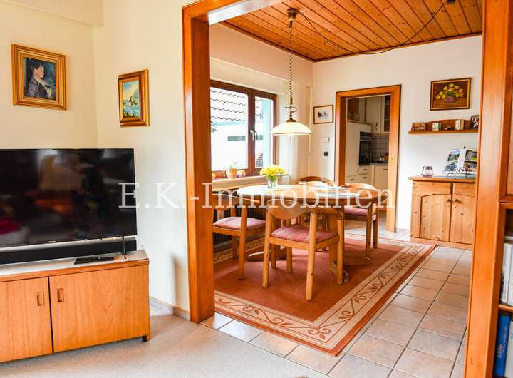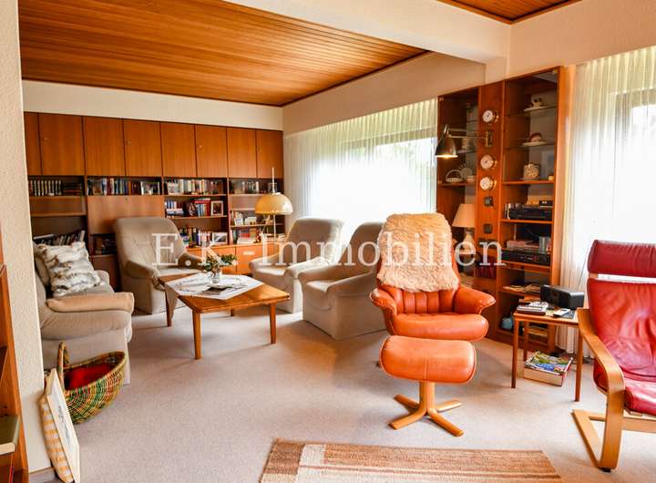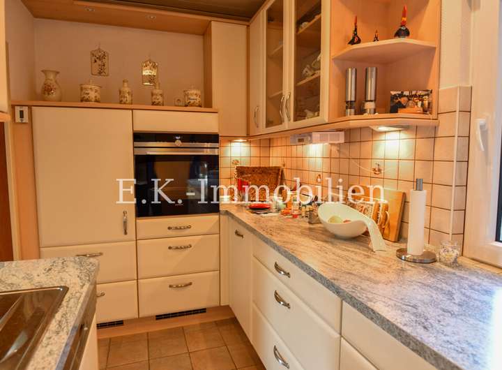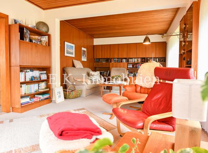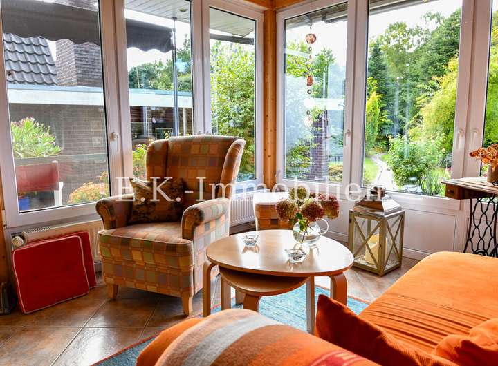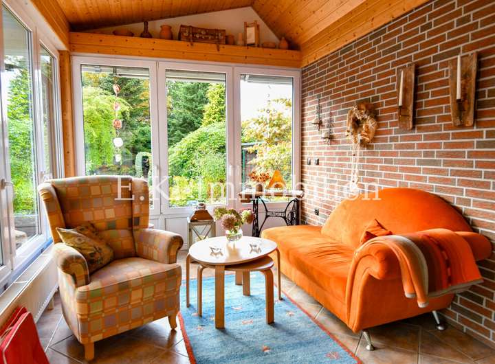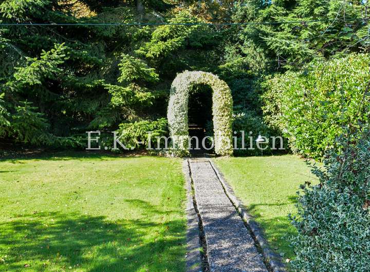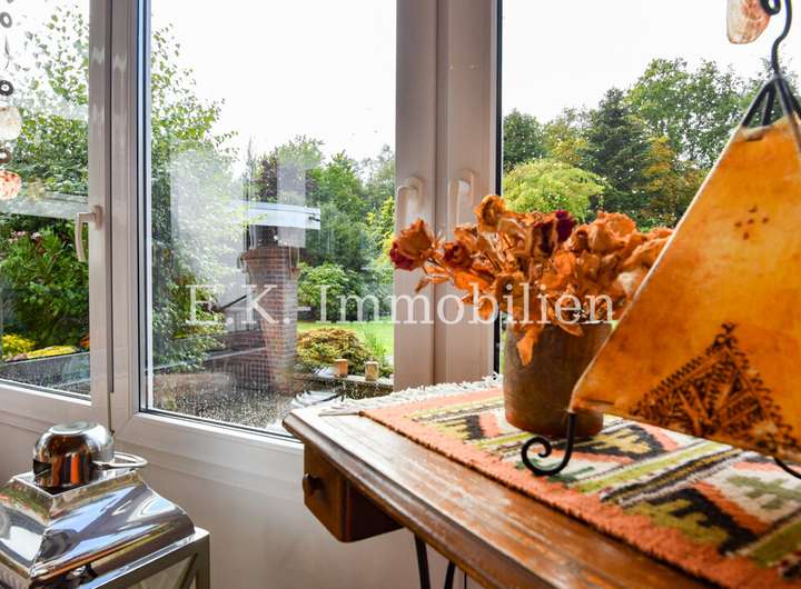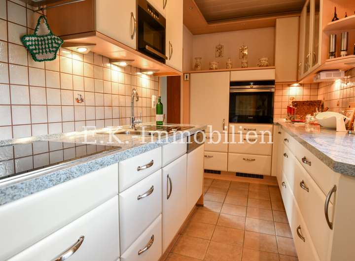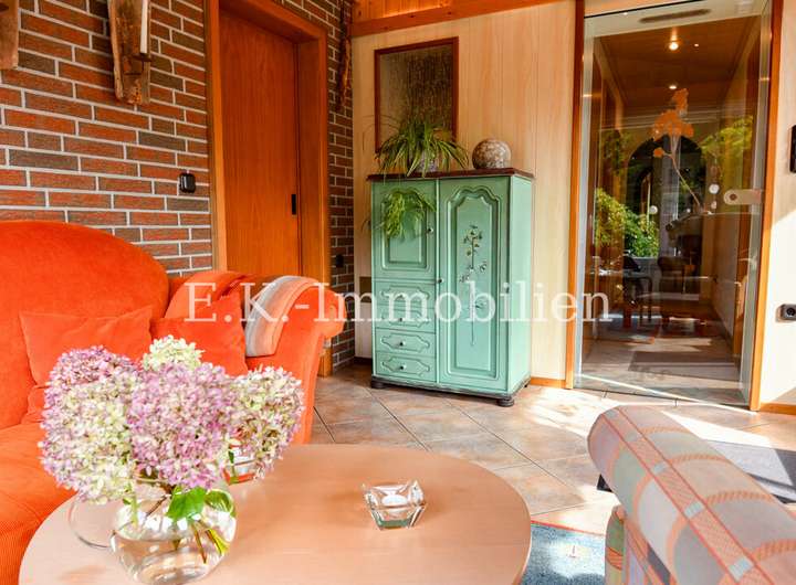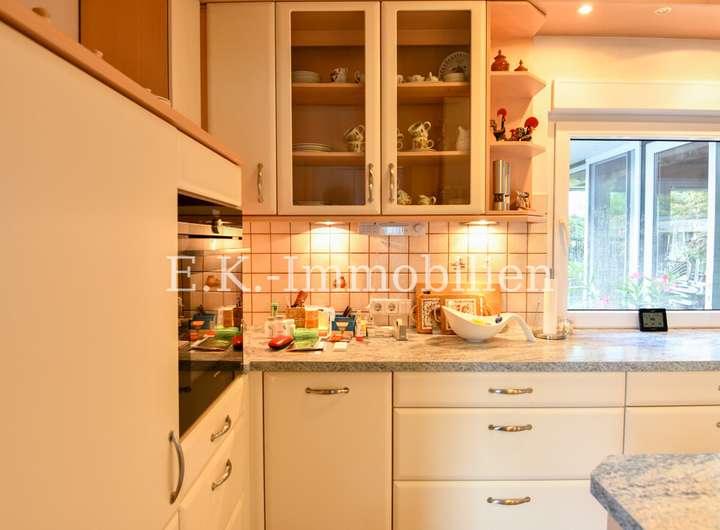 Das Herzstück bildet der große Wohnbereich mit angrenzendem Esszimmer und der funktional gestalteten Küche, die durch ihre kurze Wegeführung besonders praktisch ist. Hier entsteht ein zentraler Ort, an dem sich das Leben abspielt und gemeinsame Stunden mit Familie und Freunden genossen werden können. Ergänzt wird dieser Bereich durch den Wintergarten aus dem Jahr 2002, der mit seinem Blick in den herrlich angelegten, parkähnlichen Garten eine gemütliche Erweiterung des Wohnraums darstellt. Mehrere Terrassen rund ums Haus laden zusätzlich zum Entspannen und Verweilen ein.