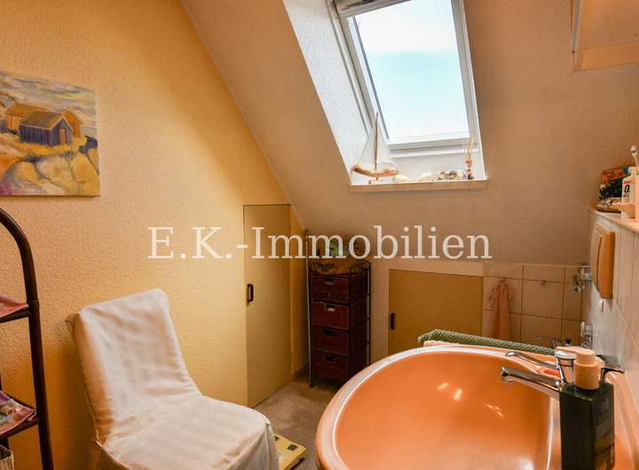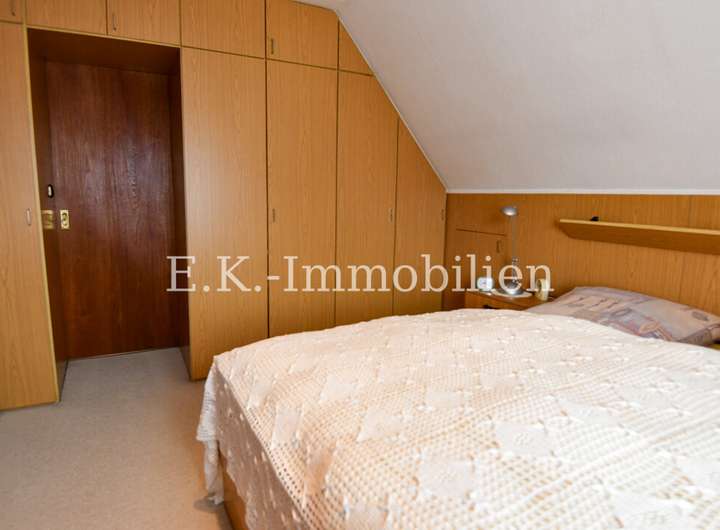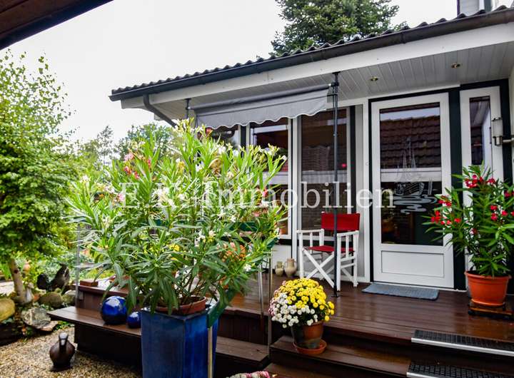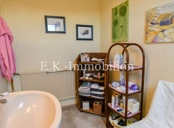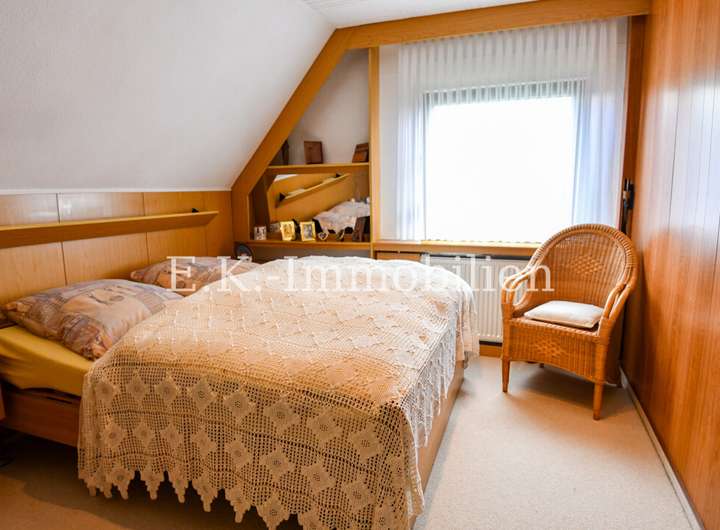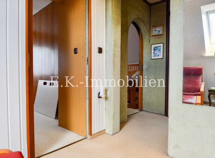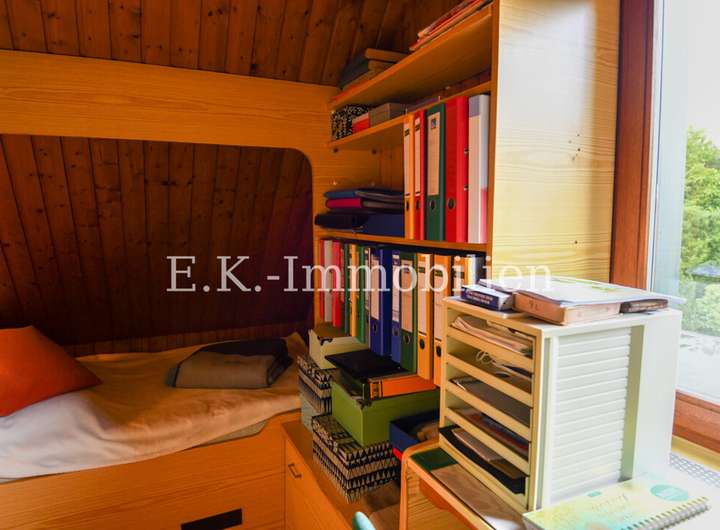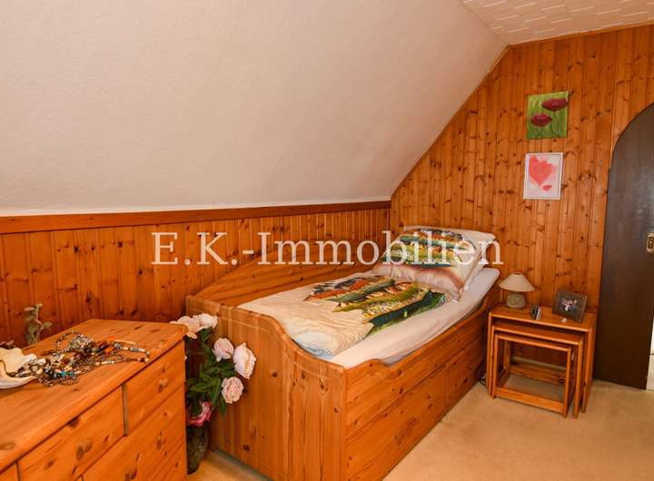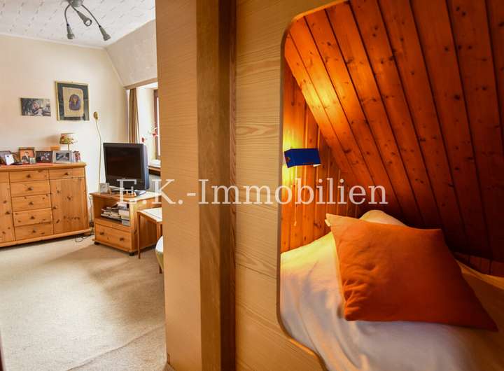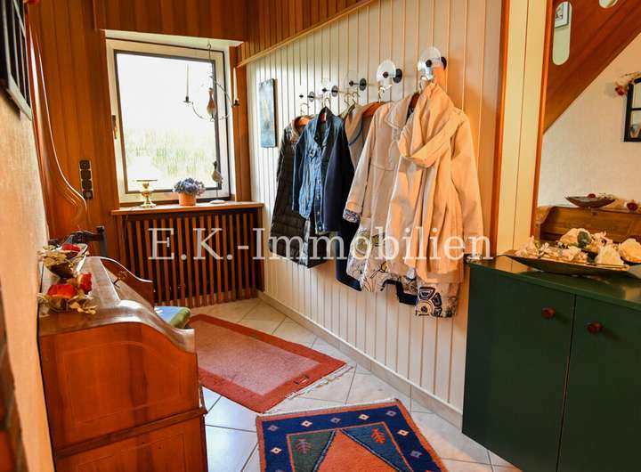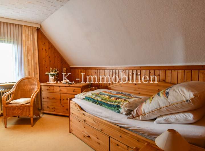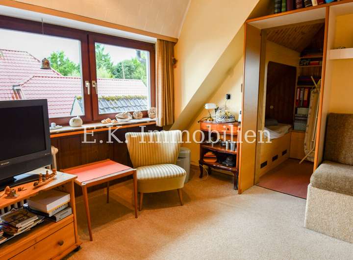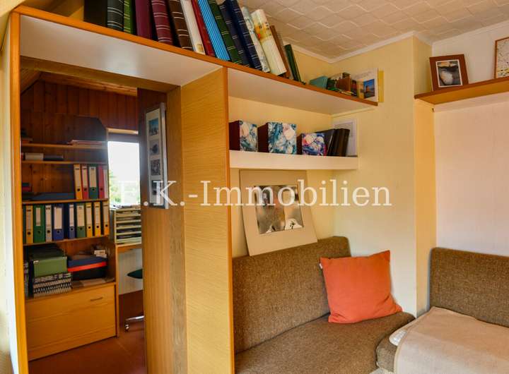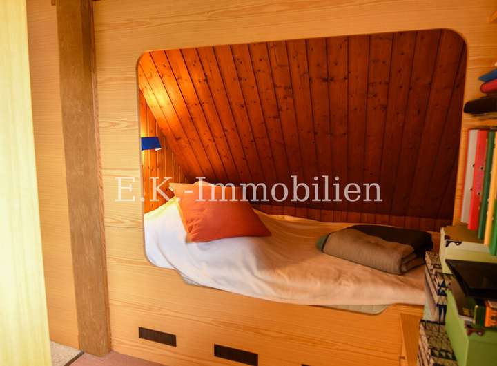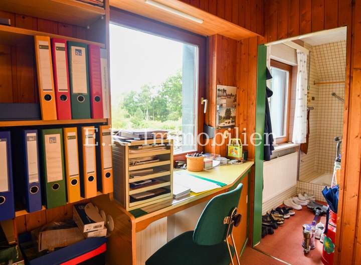 Im Obergeschoss stehen neben Schlafzimmern und Kinderzimmern zwei Bäder sowie ein flexibel nutzbares Durchgangszimmer zur Verfügung. Der gedämmte Dachboden schafft zusätzlichen Stauraum. Praktisch sind außerdem die umfangreichen Nebengebäude: eine große Garage und einige Werkstattbereiche, ein Geräteraum sowie ein Unterstand, der ehemals als Bootslager genutzt wurde und sich heute vielseitig einsetzen lässt – ob für Fahrzeuge, Holzlager oder andere Hobbys.