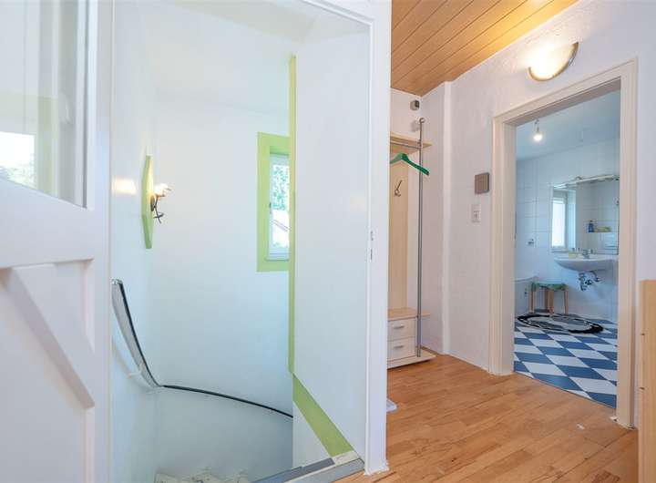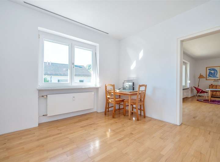 Das Erdgeschoss empfängt Sie mit einem weitläufigen Flur, der Zugang zu den zentralen Wohnbereichen bietet. Hier befinden sich neben dem großen Wohnzimmer weitere Zimmer, die flexibel als Schlaf-, Arbeits- oder Gästezimmer genutzt werden können. Die Küche verfügt über großzügige Stellflächen und ausreichend Platz für einen Essbereich. Ein Tageslichtbad rundet das Erdgeschoss funktional ab.