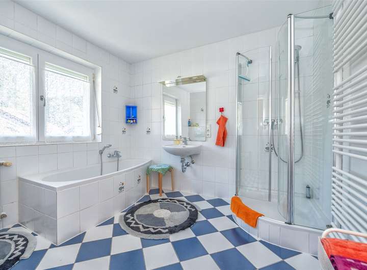 Im fast gleich geschnittenen Obergeschoss finden Sie weitere Zimmer, die sowohl als Schlafzimmer als auch als individuelle Rückzugsorte genutzt werden können. Auch auf dieser Etage steht ein modernes Bad zur Verfügung. Große Fenster sorgen in allen Räumen für ein angenehmes Licht und eröffnen den Blick auf das weitläufige Grundstück. Die hellen Wohnbereiche bieten eine freundliche Atmosphäre und hochwertige Bedingungen für das tägliche Leben. Zusätzlich sorgt der Südbalkon für eine perfekte Möglichkeit die Sonne zu genießen.