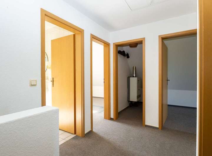 Obergeschoss: Flur | Badezimmer mit Dusche und Badewanne | Heizungsraum | Schlafzimmer | Kinderzimmer | Büro oder Gästezimmer