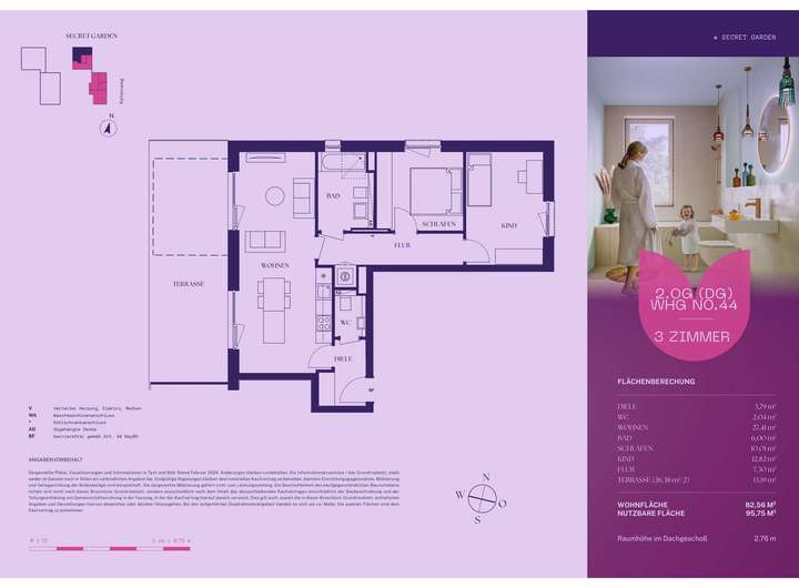 Die 3-Zimmer-Wohnung im 2. Obergeschoss (DG) beeindruckt auf ca. 82,56 m² mit einer großzügigen Raumkomposition, die Offenheit und Intimität vereint. Herzstück ist der weitläufige Wohn- und Essbereich mit Platz für eine Küche, der sich zur großen Terrasse öffnet – ein erweiterter Wohnraum im Freien, perfekt für Frühstück in der Sonne oder Abende unter dem Sternenhimmel. Das Schlafzimmer sowie ein zusätzliches Kinder- oder Arbeitszimmer schaffen vielseitige Rückzugsmöglichkeiten. Ergänzt wird der Grundriss durch ein modernes Bad mit Fenster und ein separates WC, die Alltag und Komfort elegant verbinden. Mit einer lichten Raumhöhe von 2,76 m und der besonderen Lage im Dachgeschoss entsteht hier ein Wohngefühl, das Freiraum, Stil und Behaglichkeit zu einem Ganzen vereint – im FVTVRIA Secret Garden.