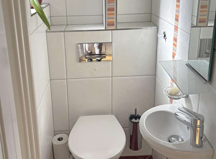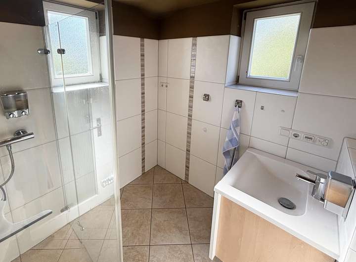 Das Tageslichtbad befindet sich ebenfalls im EG und ist mit einer bodengleichen Dusche ausgestattet. Zudem gibt es noch ein kleines Tageslicht WC.