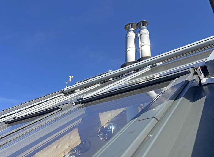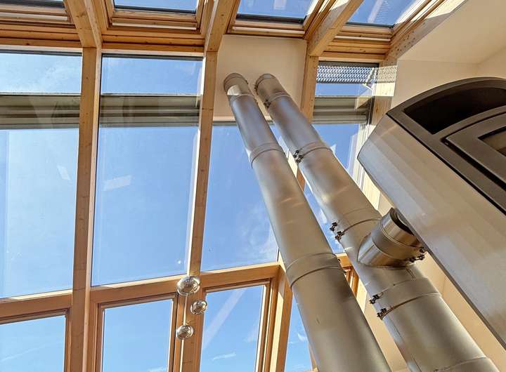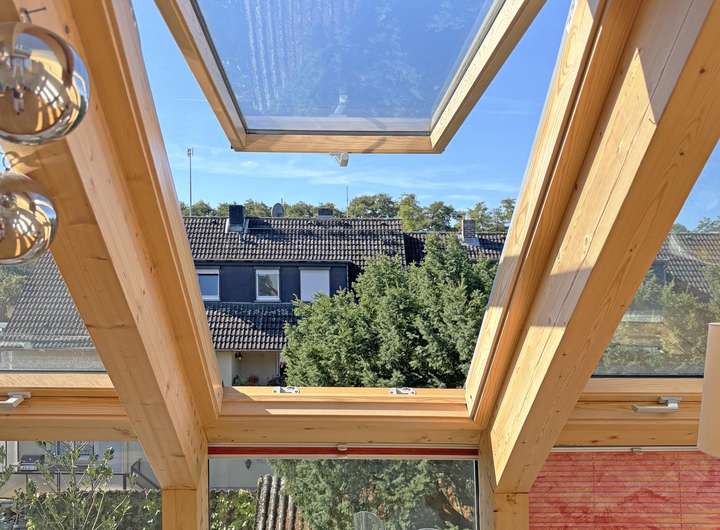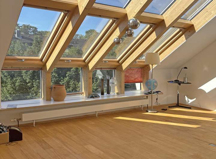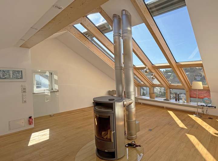aufwendig und exklusiv neu geschaffenes DG mit riesigen elektrisch zu verschattenden, Dachfensterfronten plus Windwächter, Velux Kipp-Schwing-Fenster, die sich im oberen Bereich elektrisch steuern lassen und Dachstufen zur Begehbarkeit. Zudem gibt es ein Fensterband im Kniestock, für einen Panoramablick von der Couch aus, Aufwendige Elektroinstallation mit Bodensteckdose. Mit Glaseingangstür und tollem Kaminofen. Die gebürsteten Edelstahlabluftrohren wurden individuell für dieses Projekt angefertigt