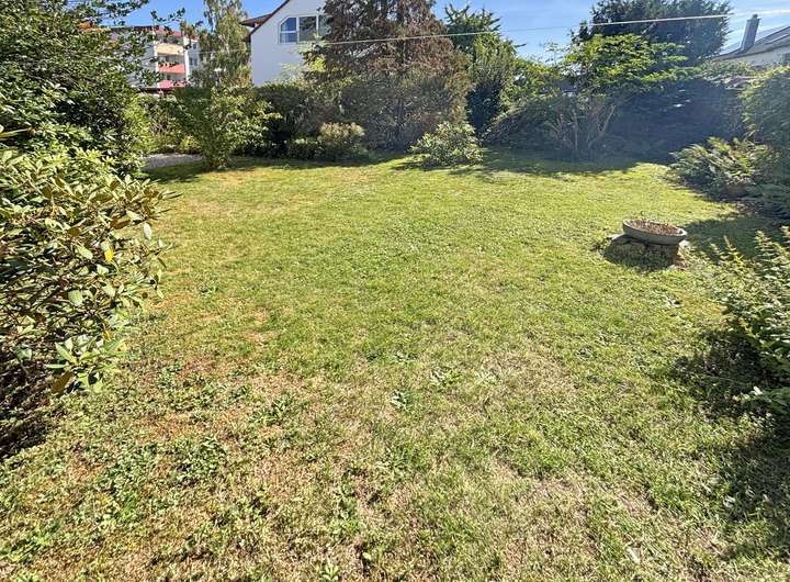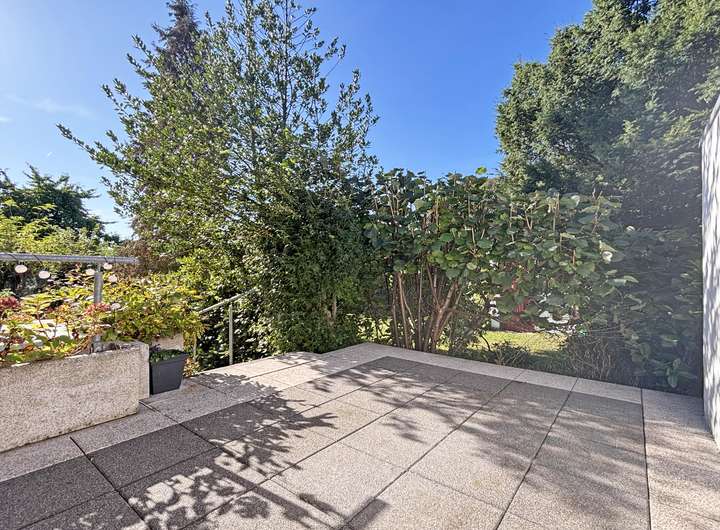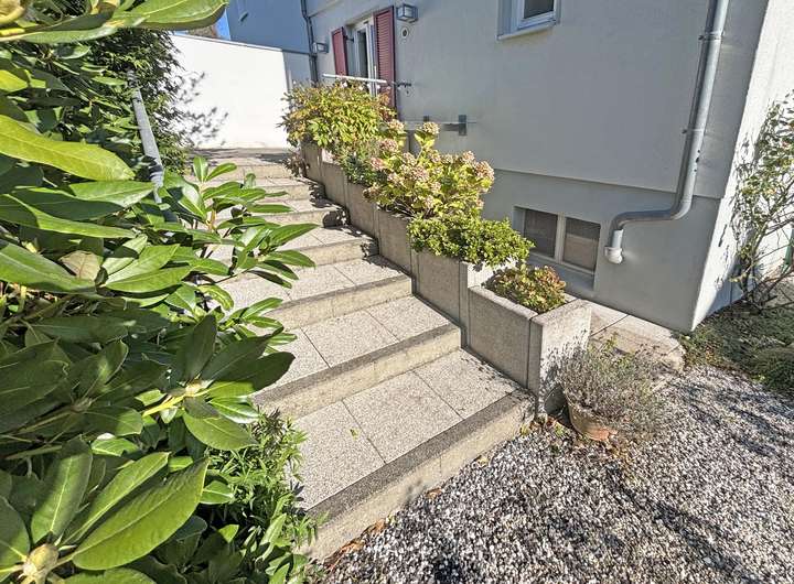 hochgesetzte, eingewachsene Terrasse für einen ebenen Austritt, massive Trennmauer zum Nachbarn