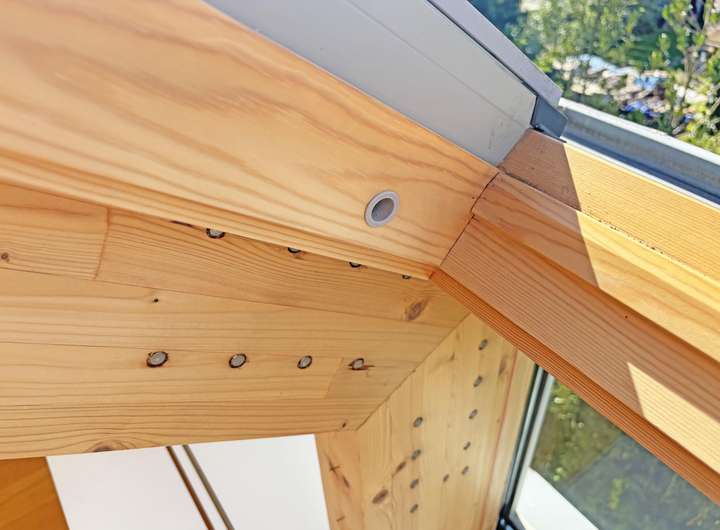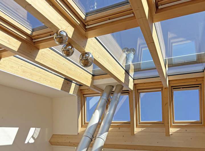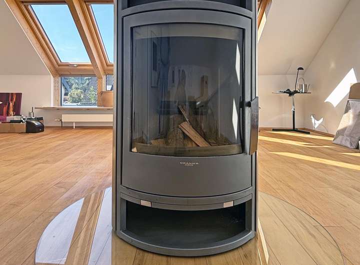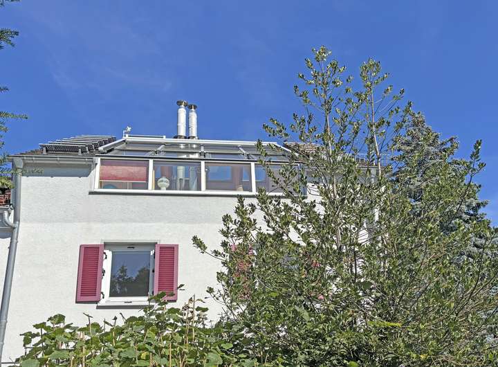 Das 2003 neu aufgesetzte Dachgeschoss hebt sich vom EG und OG deutlich mit seiner exklusiven und ausgefallenen Bauweise ab. Es wird mit Formen, Holz, Glas, Licht und Edelstahl gespielt und ein beeindruckendes Raumempfinden inszeniert. Es ist eine beeindruckende Konstruktion, die mit großem handwerklichem Geschick ausgeführt wurde und ihres Gleichen such. Dennoch entsteht hier kein Bruch, sondern das Gesamtkonzept des Hauses wird aufgegriffen und überhöht. Es ist gemütlich, hell und freundlich. Ob Lesen, Musikhören, Arbeiten, gemeinsam Zeit verbringen, der Sonne beim untergehen zuschauen, Schneeflocken treiben sehen oder am Kaminofen in die Flammen schauen, dies ist ein toller Ort, an dem man sich wohl fühlt.