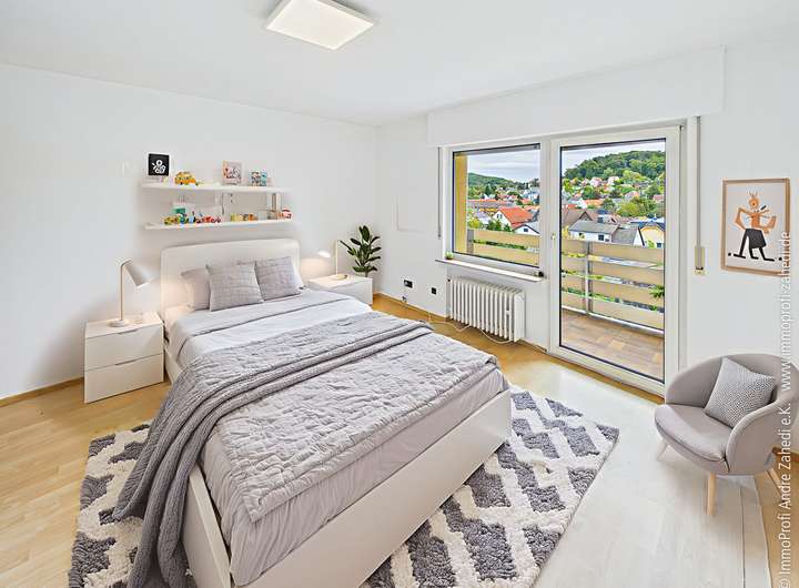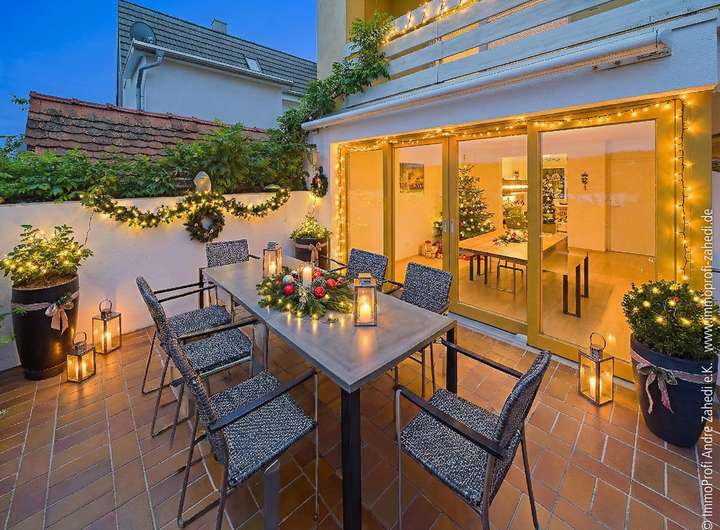 Große Fensterflächen sorgen für viel Licht, während der sonnige Balkon im Obergeschoss mit einem herrlichen Fernblick über die Dächer von Nieder-Ramstadt begeistert. An warmen Tagen genießen Sie das Familienleben auf der großen Terrasse, die dank der neuen Sonnenmarkise (2023) Schatten spendet.
