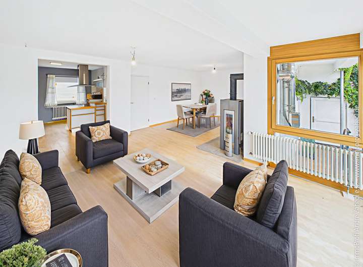 Das massiv gebaute Haus bietet Ihnen insgesamt 6,5 Zimmer, zwei modernisierte Bäder sowie ein großzügiges Wohn- und Esszimmer mit gemütlichem Kaminofen – der perfekte Ort für gemeinsame Abende mit der ganzen Familie. Die Schreiner-Einbauküche wurde 2001 eingebaut und lädt zum Kochen und Beisammensein ein.